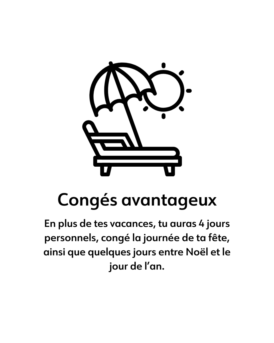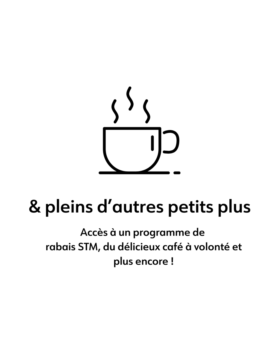 Nos employés bénéficient d’avantages conçus pour soutenir leur bien-être, notamment des rabais exclusifs, un programme d’aide aux employés, des horaires flexibles ainsi que des possibilités de développement professionnel. Le tout s’inscrit dans une ambiance de travail respectueuse et collaborative.
